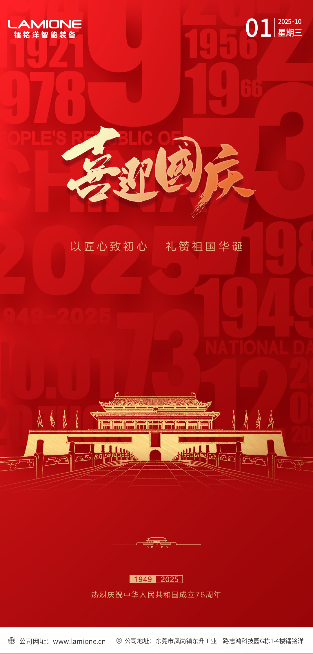 金秋十月,红旗漫卷,值此中华人民共和国成立76周年之际,镭铭洋智能装备(广东镭铭洋智能装备有限公司)向全体员工、合作伙伴及关心支持柔性显示产业发展的各界人士致以最诚挚的节日祝福!愿祖国繁荣昌盛,愿行业创新不止,愿你我共赴新程!
